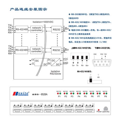 多数的工业计算机系统都用标准的RS-232串行端口,但各种仪表使用485通信较多。瑞赛特8528A转换器能让您在配有RS-232多串口卡的系统上使用RS-422及RS-485。它透明地将RS-232信号转成隔离的RS-422或RS-485信号。实现8路RS232信号输入,8路RS-422/485信号输出,可以很轻松地构建一个工业级的长距离通信系统。