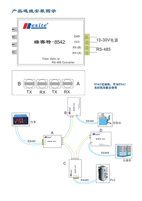 瑞赛特-8542使用标准ST接头,他与8541配合可以轻松组建RS-485光纤网,不用改变RS-485接口端设备的任何设置,可以完全避免RS-485接口的锁死现象,而且可以自适应各种传输速率,与特定型号串口光端机配合可联接成RS-485光纤环网,实现双环自愈功能。