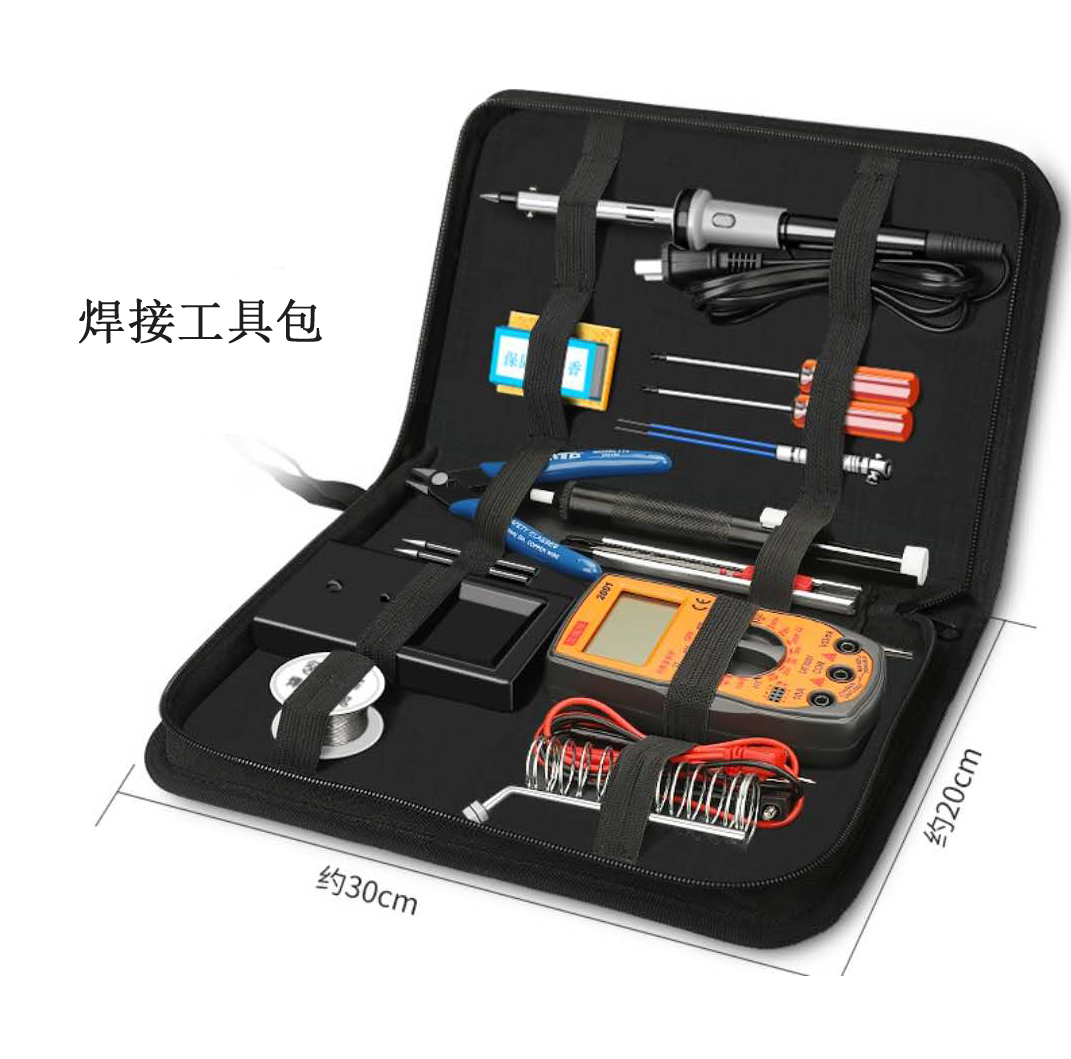 本工具包可用于电路板、元器件的日常焊接、维修使用。所含工具丰富多样、简单易用,工具包内有带固定绑带,可将各种工具稳定的绑缚在包内,便于携带、收纳使用。内含工具多为焊接常用必备工具,如:电烙铁、吸锡器,烙铁架、焊锡丝、万用表、螺丝刀等十几种工具。图片仅供参考,以实物为准。